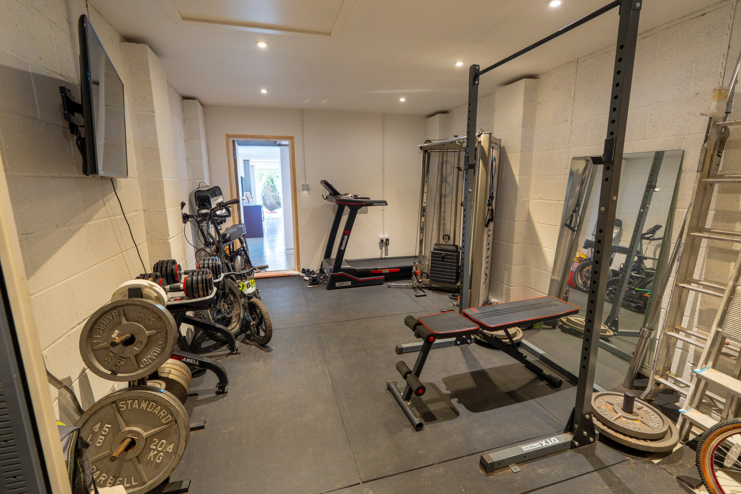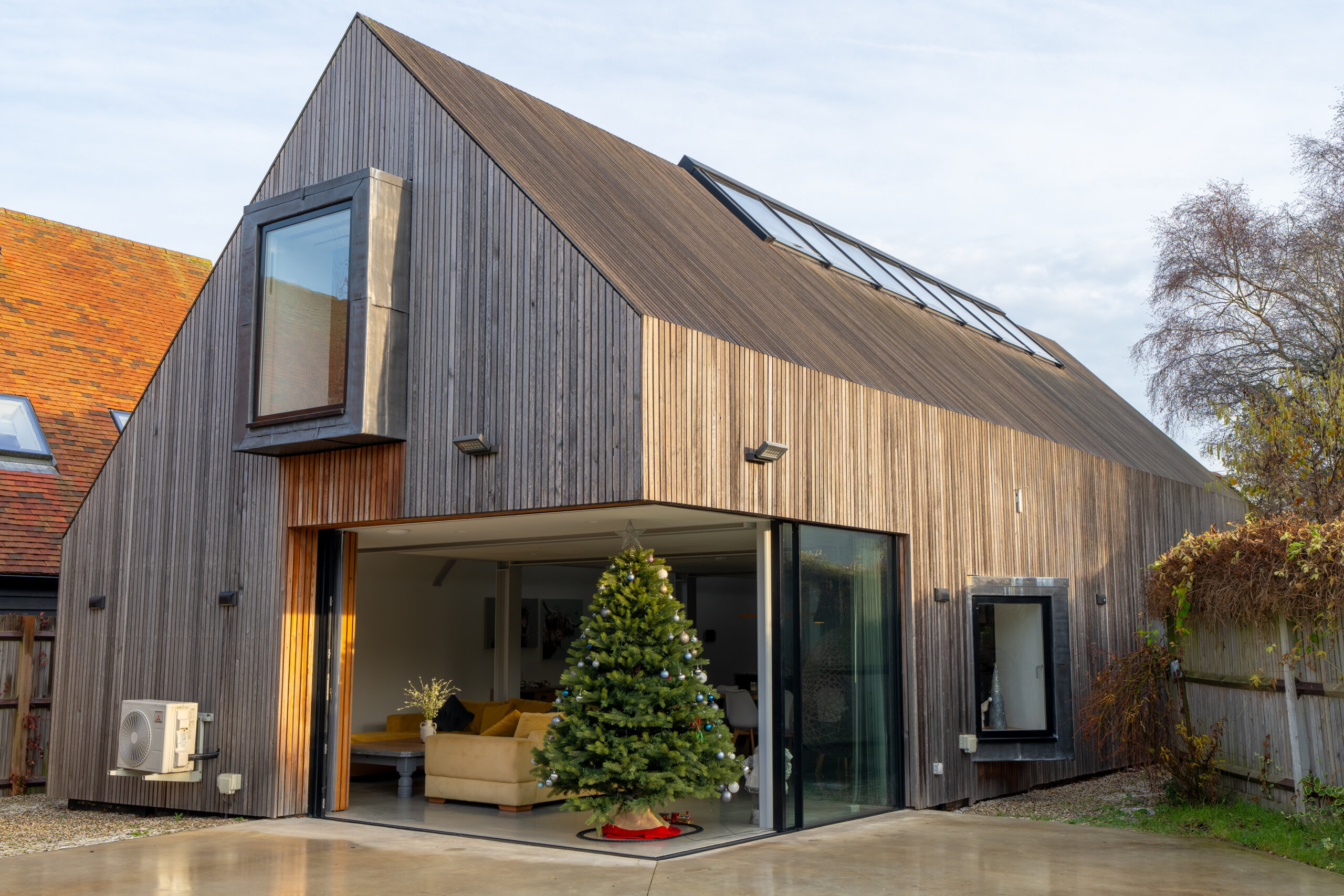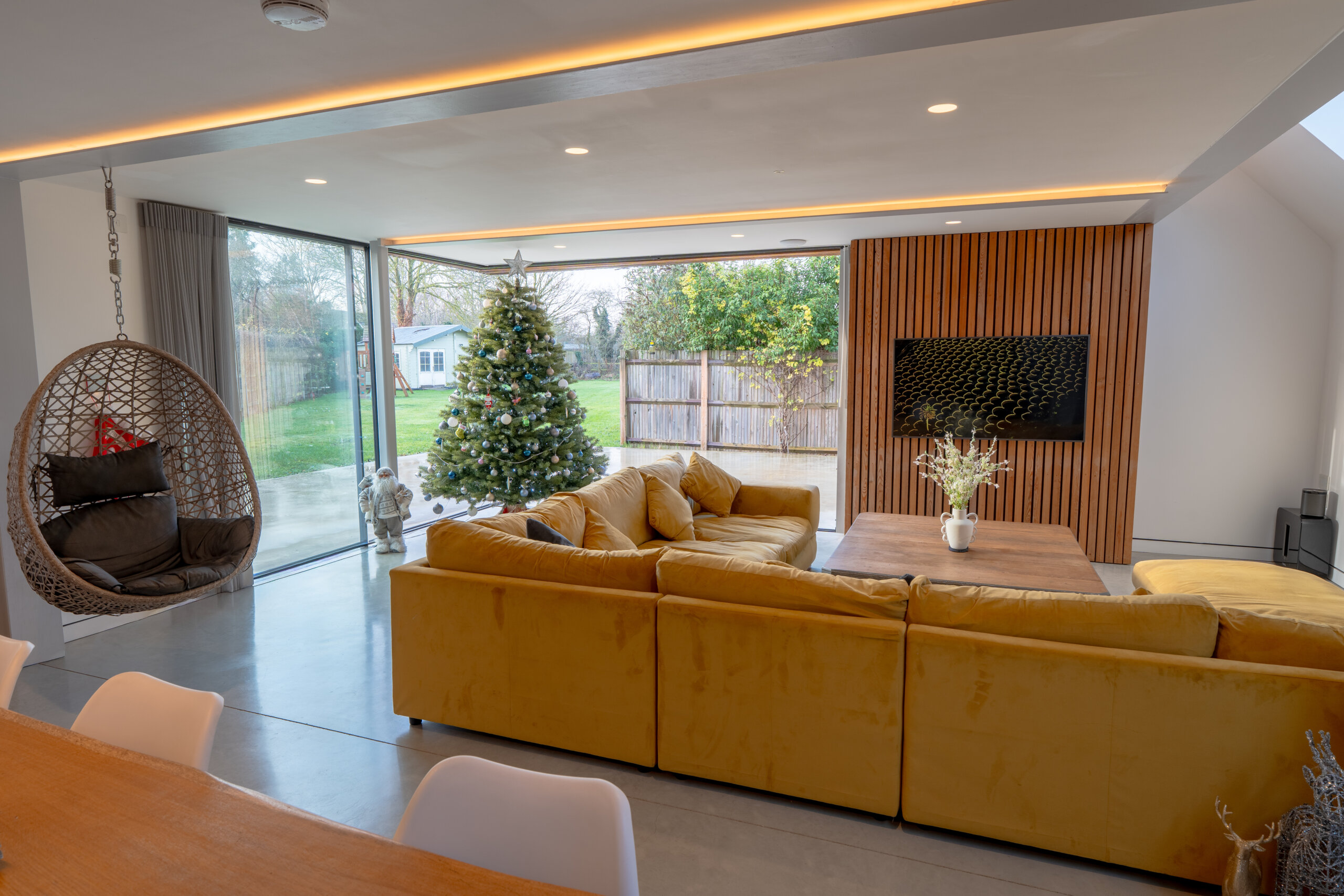 The principal entrance is via the modern extension, where polished concrete flooring leads into a breathtaking open-plan living space. Vaulted ceilings, exposed steelwork and walls of glass create an immediate sense of volume and light, while uninterrupted views draw the garden into the heart of the home. This space has been designed for both entertaining and everyday family life, with direct access to the terrace and lawn beyond.