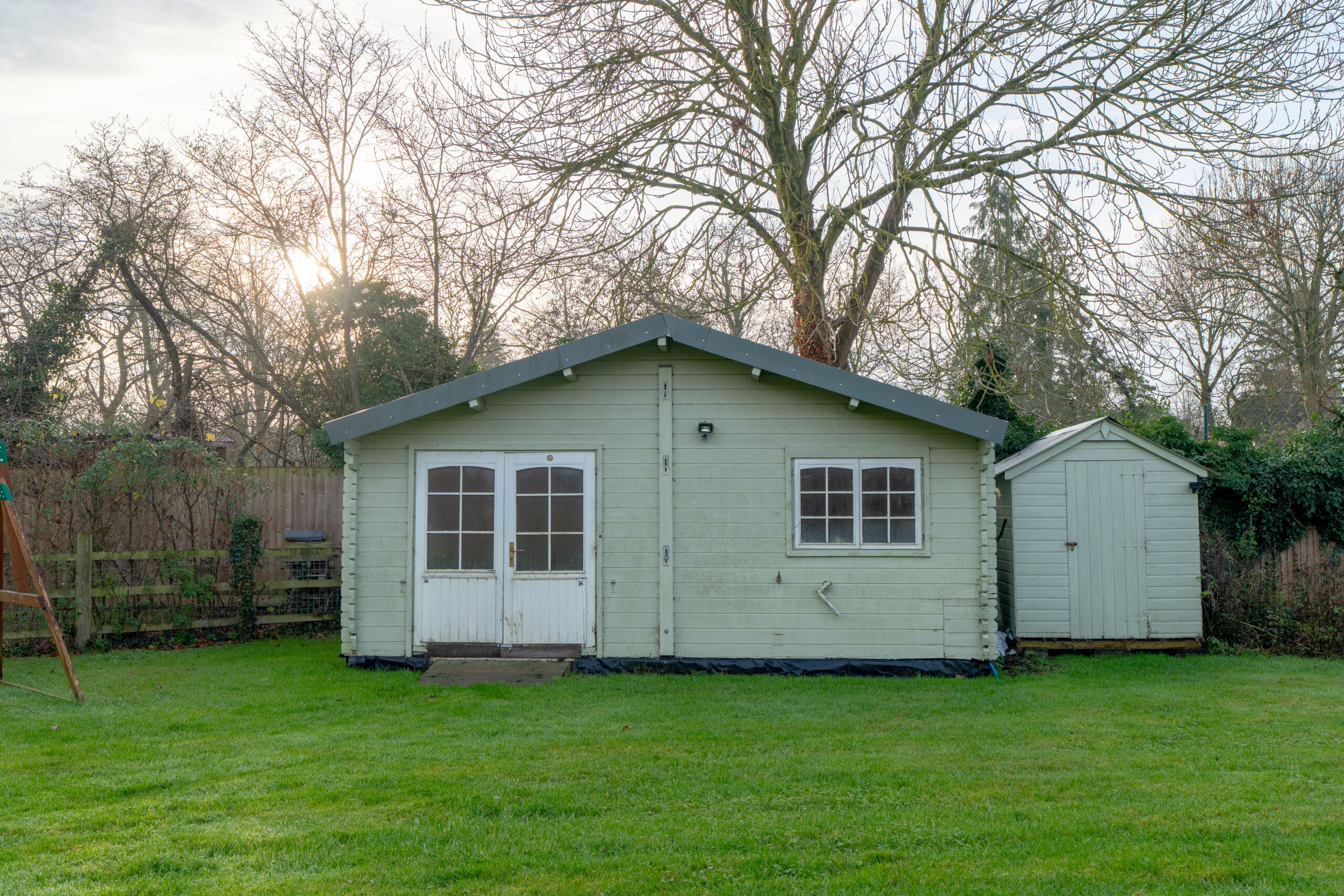The property sits within approximately a quarter of an acre, enjoying open views across surrounding countryside. The garden is predominantly laid to lawn, bordered by mature trees that provide privacy and a sense of seclusion. A paved terrace adjacent to the house offers the perfect spot for outdoor dining, while a summer house sits at the far end of the garden, ideal as a retreat or studio.